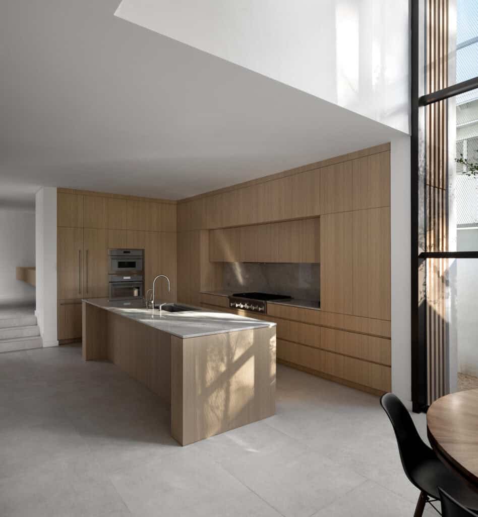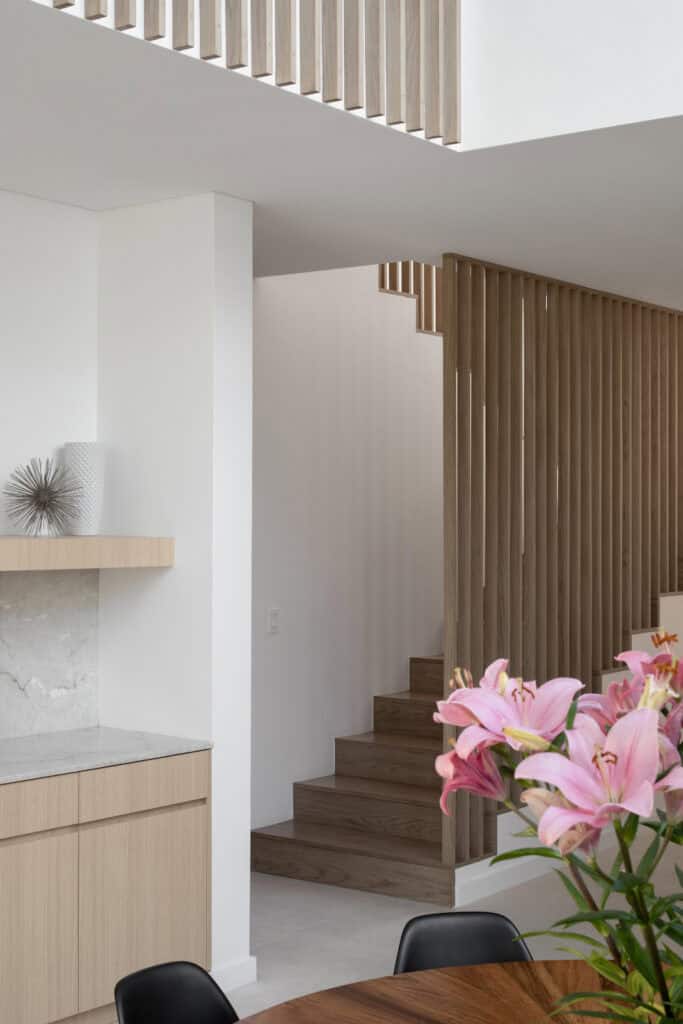 The project consists of two separate houses without them being detached from each other, to appear like a single, uniform building from the street, blending better into the residential context. The bold facade’s simple wooden louvers allows it to establish itself as a fresh entity. The interior is no different, the wooden louvers work functionally and decoratively, complementing each space by adding warmth and comfort.