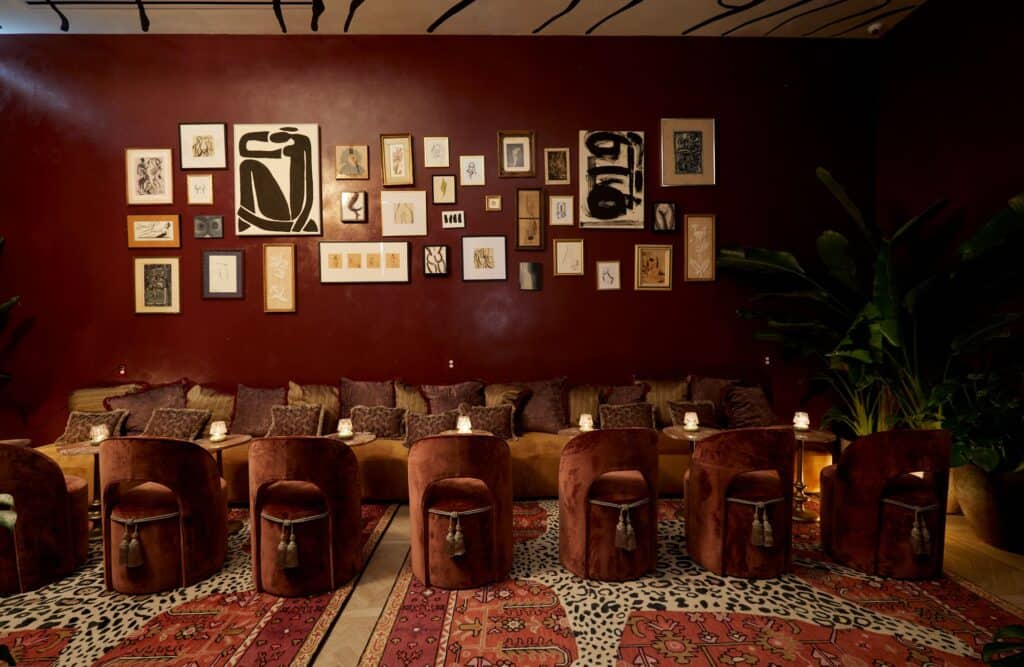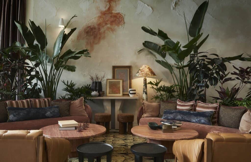 The restoration included preserving key original historic elements including an original skylight, 12-foot arched windows, ornate tin ceilings,120-year-old doors that have been retrofitted for sound and safety, and a vintage elevator cage turned light fixture, blending the past with bold design. The main lobby space features two custom murals, including a ceiling mural that is a nod to the building’s history depicting an abstract elephant and lion.