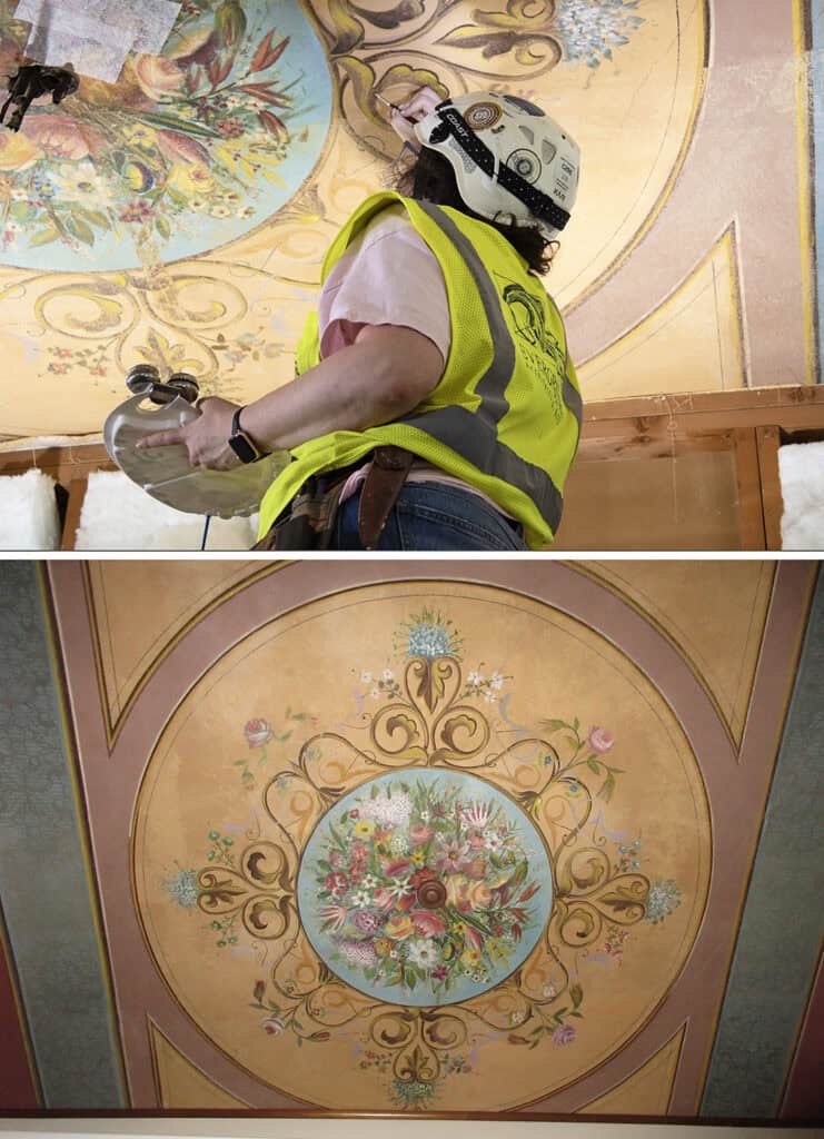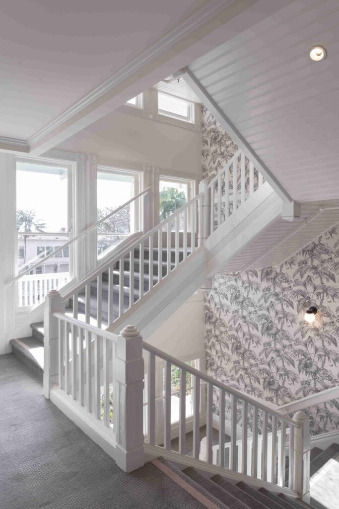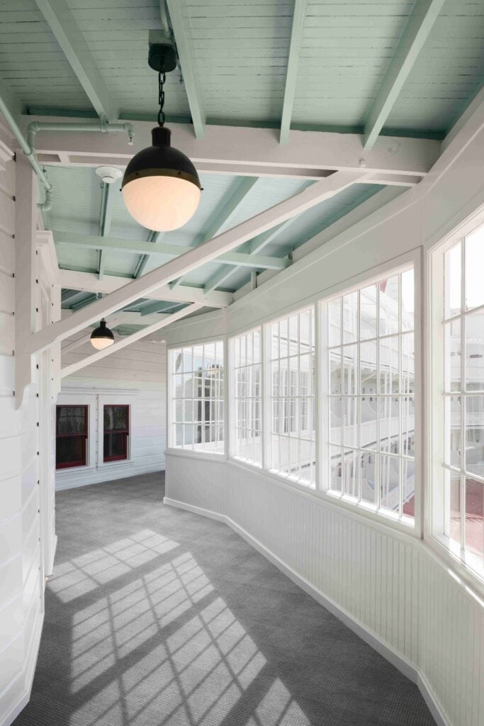 On the exterior, non-historic modifications were removed, and hundreds of replica wood windows were installed to match the original architecture. The building’s historic color palette was restored, including the signature “haint blue” ceilings on the verandas and vibrant red window sashes.