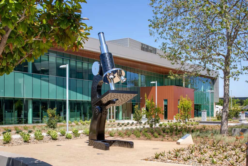 Sustainable design is integral: low-carbon concrete and steel, solar power, and natural ventilation reduce embodied carbon by 23%. Located along the campus’s central art spine, the building features five public art installations, including a COVID-19 memorial garden and a large-scale microscope sculpture—honoring science and resilience.
