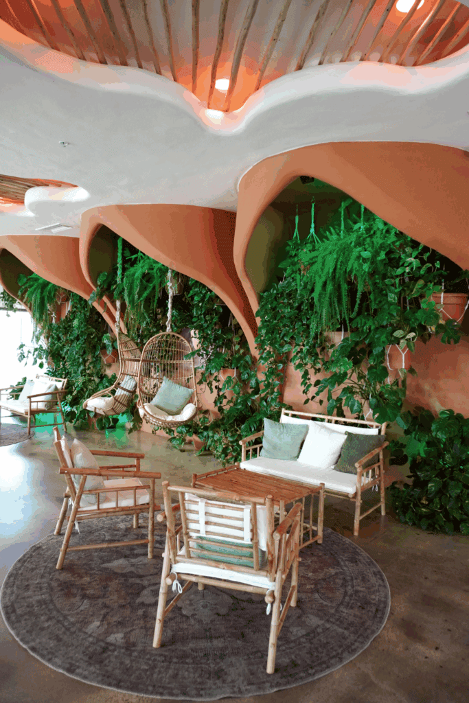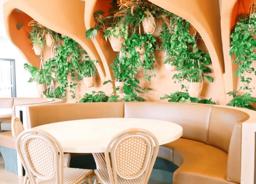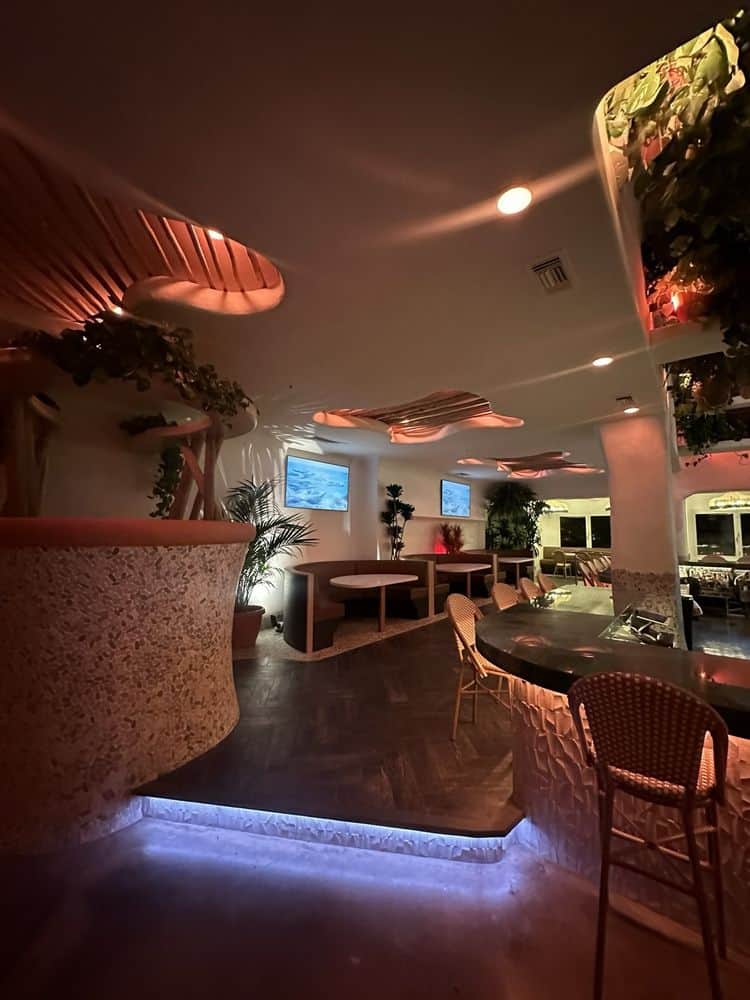 The Beverly is a coastal California restaurant located in Pacific Beach. Its rooftop design embraces the natural beauty of its surroundings, offering ocean views. At the rooftop, there is elevated seating at the rear that ensures every guest enjoys the view of the ocean creating an inclusive and memorable experience. At the heart of the rooftop space, there’s a tranquil water feature with meandering streams, rocks and lush greenery. This design element evokes the calming rhythm of the ocean. Although you still get ocean views on the main floor, the rooftop rivers cast a shimmering, ocean-like glow that enhances the interior ambiance below. Being located in the heart of Pacific Beach allows for an easy meeting spot for the local community whether it’s a post-beach gathering spot or casual destination for boardwalk wanderers.