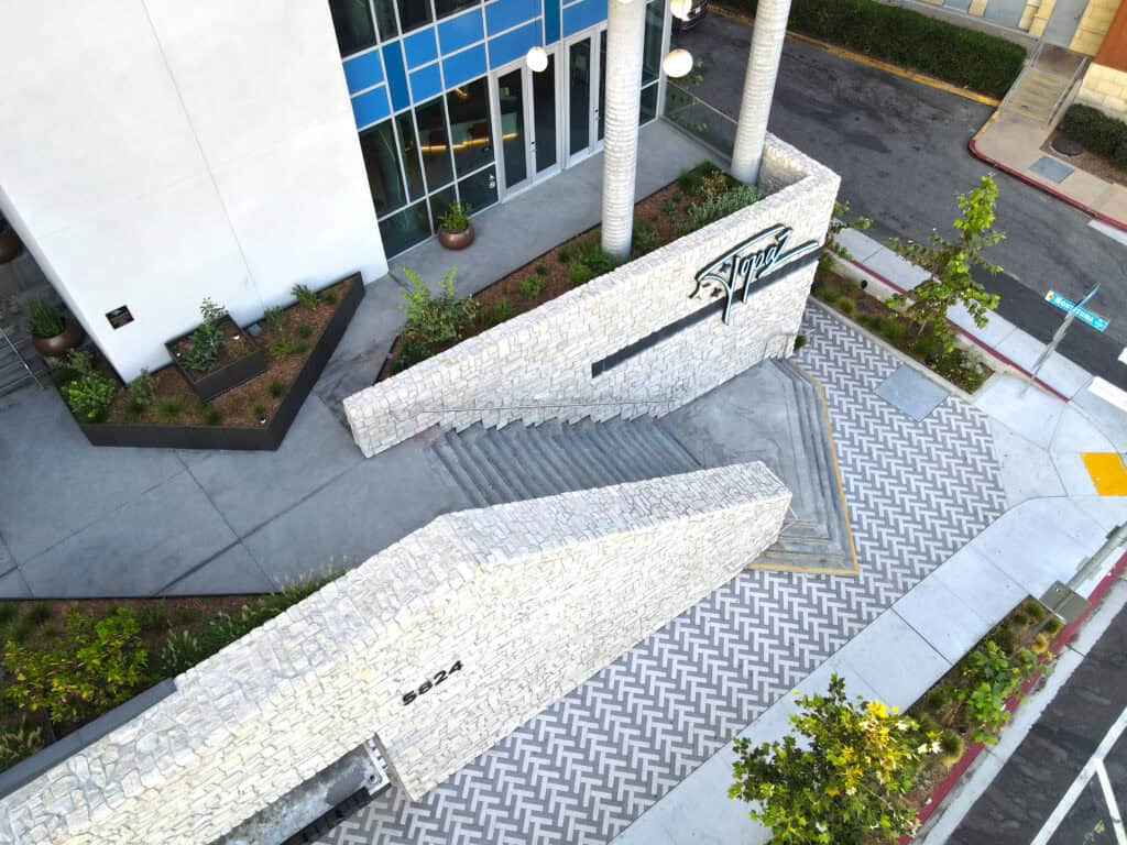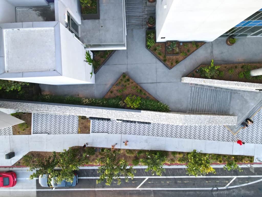 The project also features a thoughtful stormwater management strategy that includes an on-site raised planter system to intercept rooftop runoff, directing water to a subterranean Modular Wetland System. This system captures, treats, and detains all site runoff before it enters the City’s stormwater system, demonstrating a commitment to ecological responsibility and urban resilience.