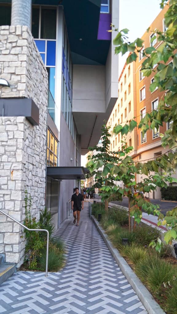 Through its landscape and site design, McCullough created a unique public realm that relates to its surroundings while standing out, offering a streetscape inspired by San Diego’s canyons and coastal vistas. Rich, textural paving, site furnishings, native and climate-appropriate plantings, and integrated public art all contribute to a design that elevates the pedestrian experience and reflects a sense of place.
