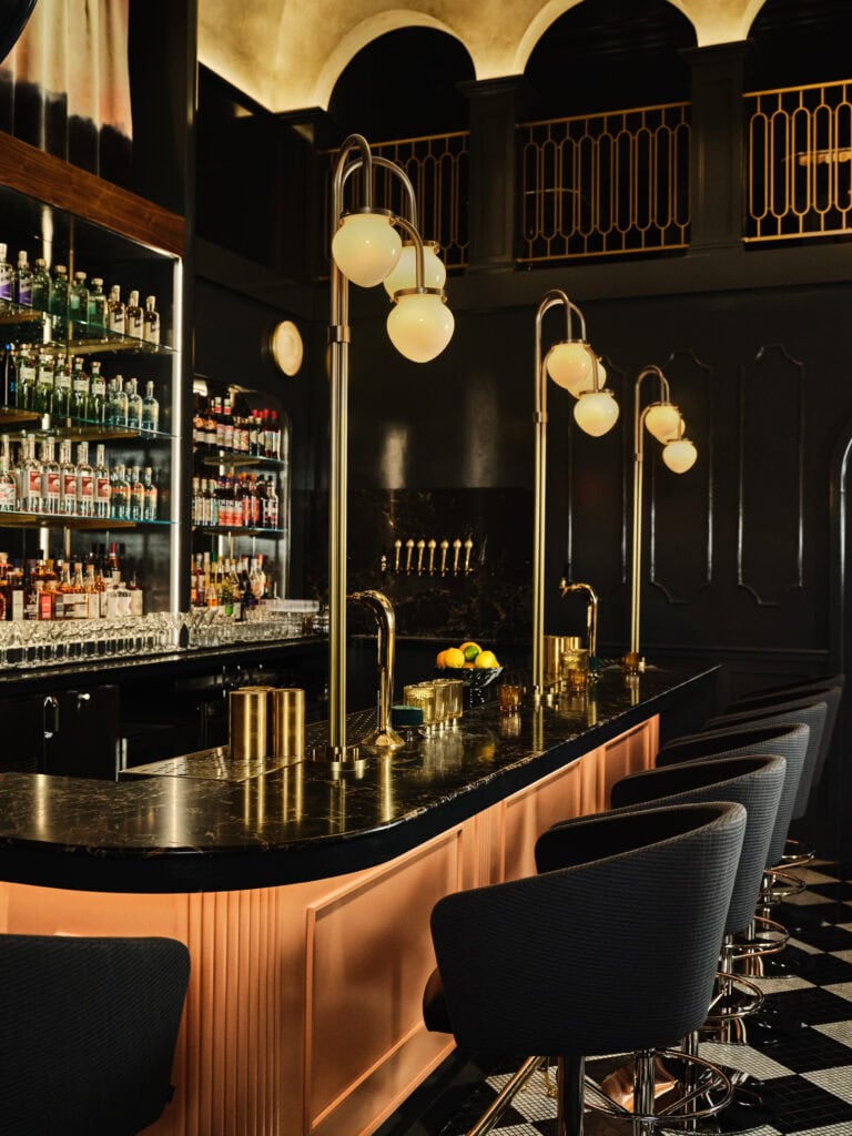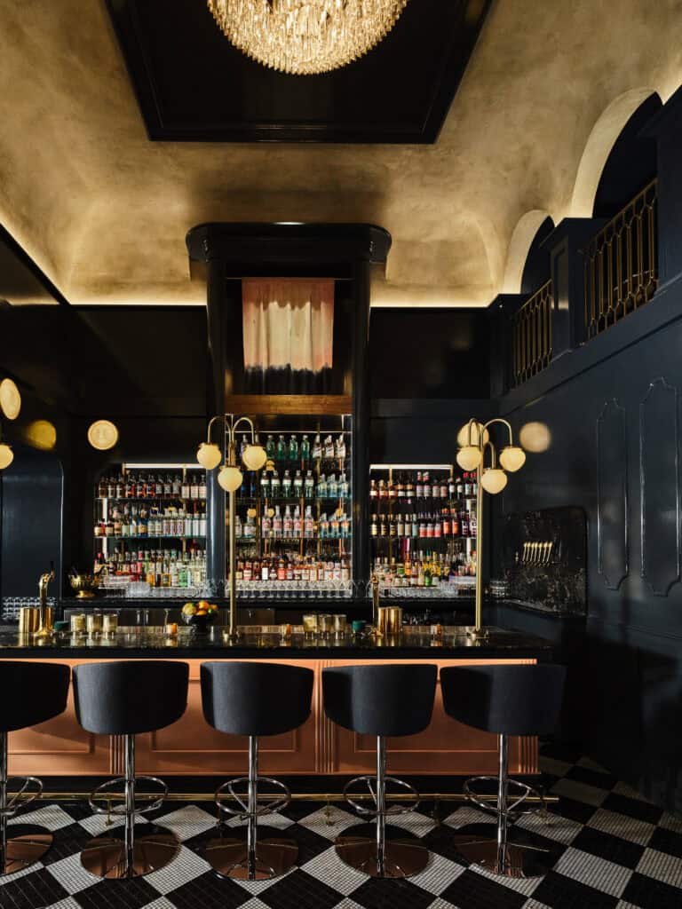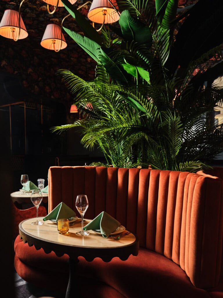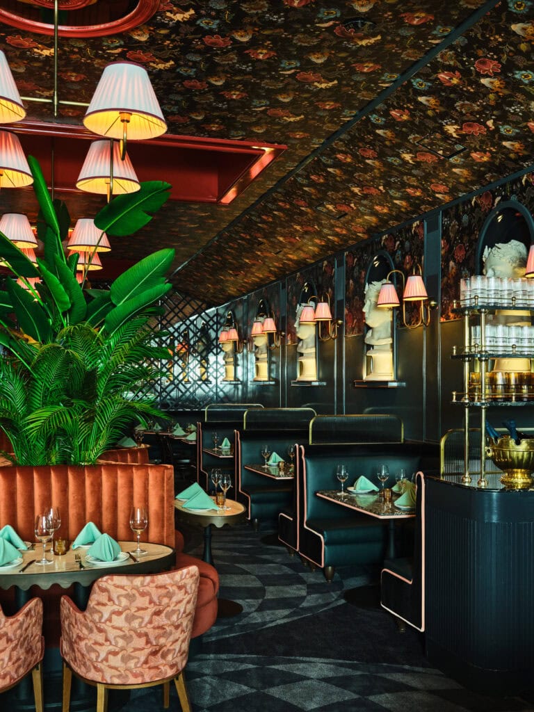 Vulture is a bold and moody restaurant inspired by Neoclassical forms that elevate a menu that riffs on the golden age of American continental-style fine dining—think martinis, oysters Rockefeller, and steak Diane, but entirely vegan. The space is rich and romantic with an air of dramatic glamour reimagined through a modern lens. It’s a place of surrender and delight—at once nostalgic and surreal, while remaining contemporary. We leaned into contrasts: detailed custom millwork and mythological motifs sit alongside lush greenery and flamboyant floral patterns, blurring the line between the organic and the built. The devil is in the details, literally—gods, demons, and fantastical creatures appear in unconventional ways, guiding guests through the dining experience. There’s a sense that nature is gently overtaking the room, which gives it a quiet tension—something a little mysterious, a little decadent. Custom work includes plaster by Ben Lai; textiles by Jessi Highet; statues by Anthony Hart; and lighting throughout by Home Studios.