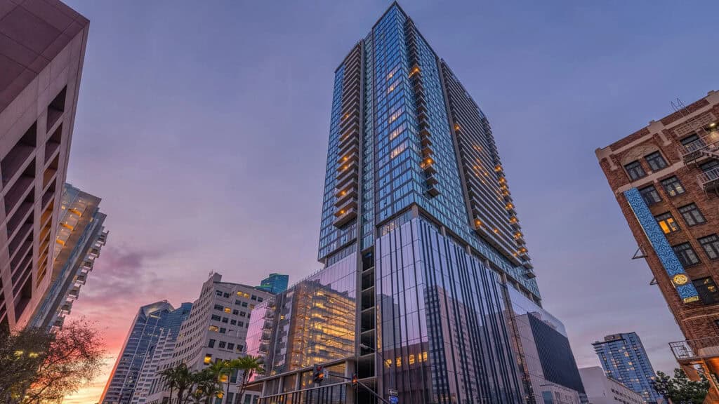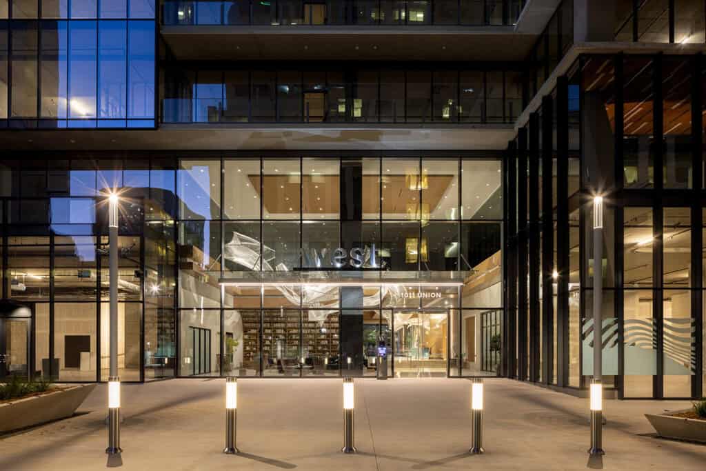 Located at the start of Union Street, a designated green street, West serves as a focal point by cantilevering over a public plaza that serves as a communal living room for downtown residents. Additionally, the nearby SDMTS Blue and Green trolley lines, accessible via the Courthouse Trolley Stop, make car-free commuting easy for tenants and employees, including SANDAG, who chose this location to emphasize their commitment to public transit.